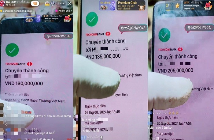 | Các giao dịch chuyển tiền của shop "Đá quý Hoàng Duẩn". (Ảnh: chụp lại màn hình từ một phiên livestream). |