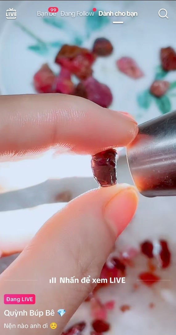 | Shop "Quỳnh Búp Bê" tổ chức nhiều phiên livestream đập đá tìm ngọc trên mạng xã hội TikTok. (Ảnh: chụp lại màn hình từ phiên livestream) |