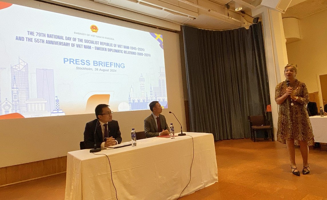 Ngày 26/8, tại Thuỵ Điển, Đại sứ quán Việt Nam tại Thuỵ Điển đã tổ chức họp báo về chuỗi sự kiện chào mừng kỷ niệm 79 năm Quốc khánh nước Cộng hòa xã hội chủ nghĩa Việt Nam (1945-2024) và 55 năm quan hệ ngoại giao Việt Nam - Thụy Điển (1969-2024).