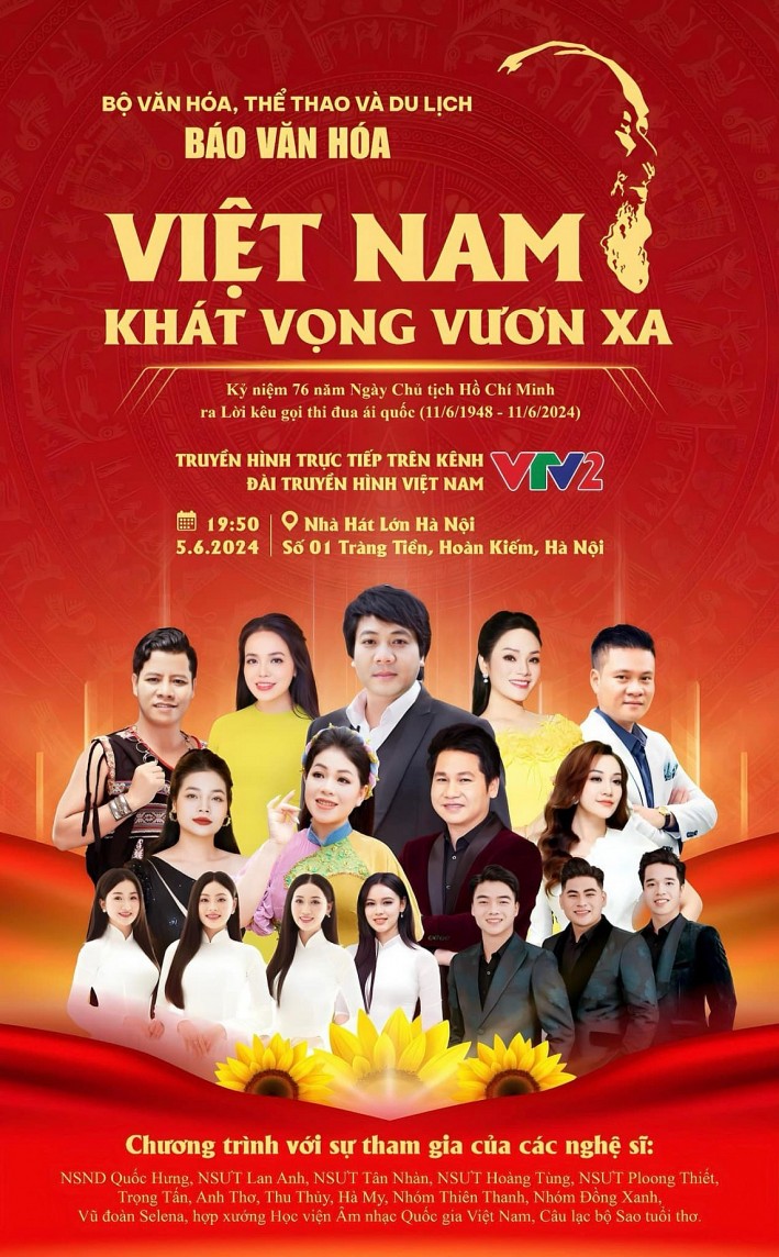 Chương trình nghệ thuật đặc biệt mang tên "Việt Nam - Khát vọng vươn xa" được Bộ Văn hoá, Thể thao và Du lịch chỉ đạo Báo Văn Hóa phối hợp với các đơn vị liên quan tổ chức tại Nhà hát Lớn Hà Nội hướng đến kỷ niệm 76 năm Ngày Bác Hồ ra Lời kêu gọi Thi đua ái quốc (11/06/1948 - 11/06/2024).