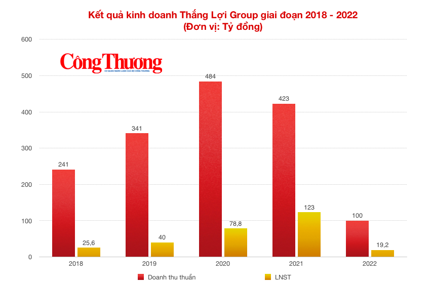 Trường hợp của Thắng Lợi Group cũng không khá khẩm hơn. Sau khi bất ngờ tăng vọt doanh thu và lợi nhuận lên mức "đỉnh" vào năm đại dịch Covid-19 hoành hành (2020), lần lượt đạt 484 tỷ đồng và 78,8 tỷ đồng (tăng 42% và 97% so với năm 2019), kết quả kinh doanh bắt đầu "trượt dốc".