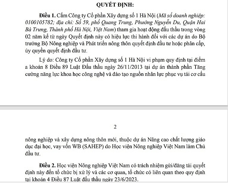 Bộ NN&PTNN cho biết, HACC1 đã vi phạm quy định tại điểm a, khoản 8 Điều 89, Luật Đấu thầu 2013 tại dự án thành phần tăng cường năng lực khoa học công nghệ và đào tạo nguồn nhân lực phục vụ tái cơ cấu nông nghiệp và nông thôn mới, thuộc dự án nâng cao chất lượng giáo dục đại học, vay vốn World Bank (SAHEP) do Học viện Nông nghiệp Việt Nam làm chủ đầu tư.