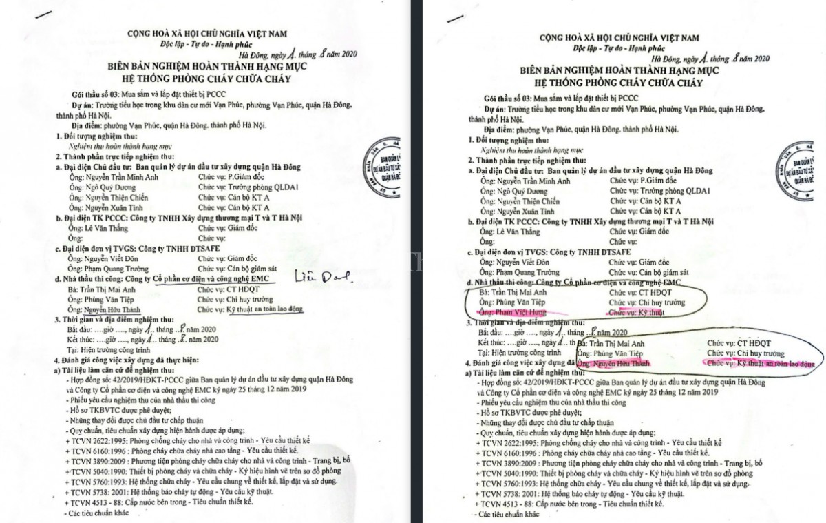 Điểm đáng chú ý là mỗi biên bản lại có 2 bản scan, cùng một nội dung, nhưng một số nội dung trong biên bản lại khác nhau. Cụ thể, đối với Biên bản số 1, phần nhà thầu thi công là Công ty Cổ phần cơ điện và công nghệ EMC: Một bản scan biên bản thể hiện có bà Trần Thị Mai Anh, Chủ tịch Hội đồng quản trị; ông Phùng Văn Tiệp, chỉ huy trưởng và ông Phạm Việt Hùng, kỹ thuật. Bản scan biên bản còn lại, vẫn có bà Trần Thị Mai Anh, Chủ tịch Hội đồng quản trị; ông Phùng Văn Tiệp, chỉ huy trưởng; song thành phần thứ 3 lại là ông Nguyễn Hữu Thành, kỹ thuật an toàn lao động.