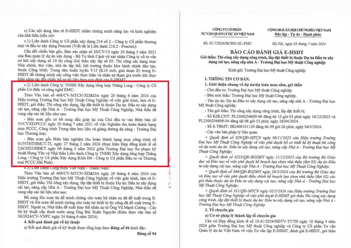 Theo phản ánh của bạn đọc, liên danh Công ty TNHH Xây dựng tổng hợp Thăng Long – Công ty Cổ phần Cơ điện và công nghệ EMC đã sử dụng 2 biên bản nghiệm thu nêu trên để làm hồ sơ năng lực tham gia gói thầu của Trường Đại học Mỹ thuật Công nghiệp.