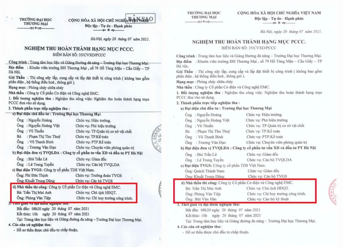 Trong đó, có Biên bản số 1 - Biên bản số 35/CVXD/PCCC ngày 20/7/2021 về việc nghiệm thu hoàn thành hạng mục PCCC, công trình Trung tâm học liệu và giảng đường đa năng, Trường Đại học Thương mại. Theo giải trình, đơn vị trúng thầu đã cung cấp bản scan gốc bổ sung dấu giáp lai của chủ đầu tư vào Biên bản số 1.