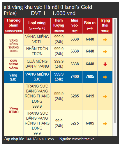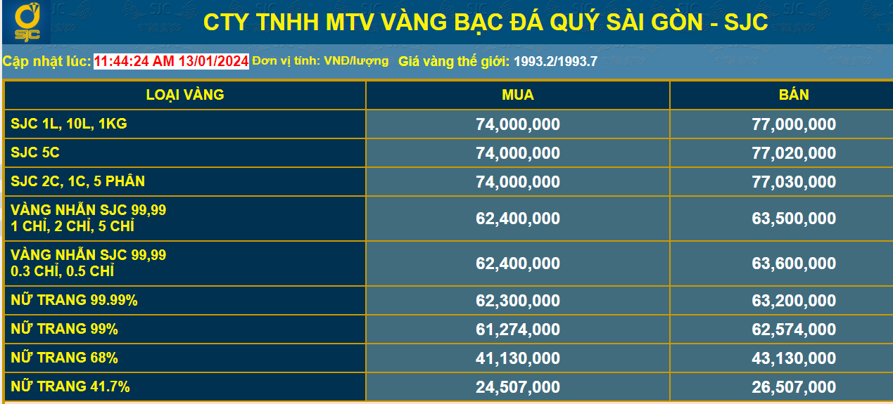 | Giá vàng SJC niêm yết tại Công ty TNHH MTV Vàng Bạc Đá quý Sài Gòn. Ảnh chụp màn hình lúc 16h ngày 14/1/2024 |