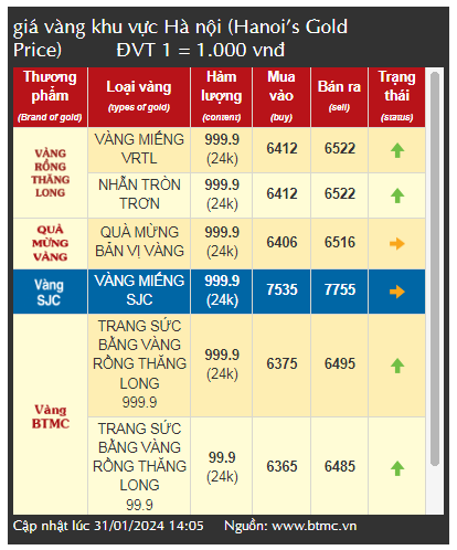 | Giá vàng SJC niêm yết tại Công ty TNHH MTV Vàng Bạc Đá quý Sài Gòn - SJC. Ảnh chụp màn hình lúc 16h chiều 31/1/2024 |