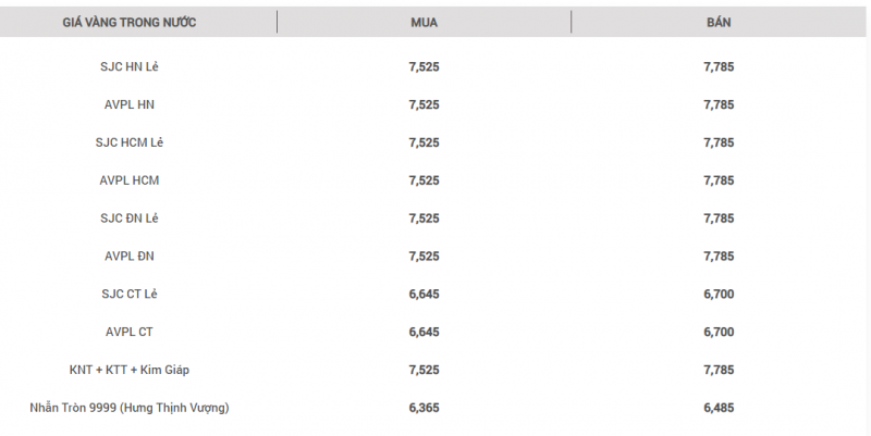 Tại Công ty TNHH MTV Vàng Bạc Đá quý Sài Gòn - SJC, giá vàng SJC niêm yết ở mức 75,4 triệu đồng/lượng mua vào và bán ra ở mức 77,9 triệu đồng/lượng. So với rạng sáng cùng ngày, giá vàng SJC đã tăng 500.000 đồng/lượng ở chiều mua và tăng 480.000 đồng ở chiều bán ra.