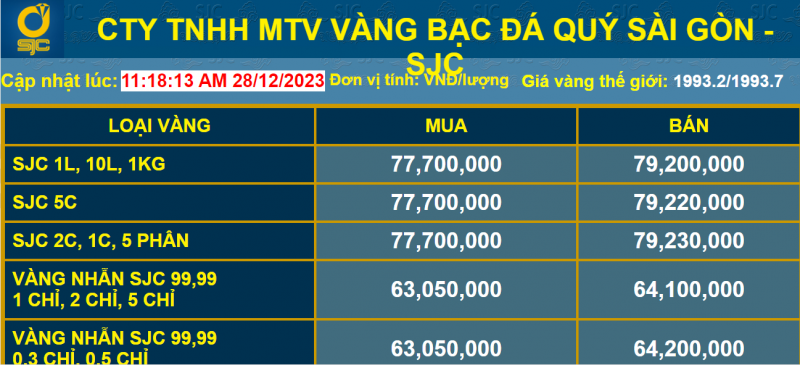Thời điểm 13h ngày 28/12/2023, giá vàng trong nước đã giảm sát về mức 79 triệu đồng/lượng bán ra. Tại Công ty TNHH MTV Vàng Bạc Đá quý Sài Gòn - SJC giá vàng SJC niêm yết chiều mua vào ở mức 77,7 triệu đồng/lượng, bán ra ở mức 79,2 triệu đồng/lượng. So với rạng sáng cùng ngày, giá vàng tại đơn vị này giảm 100.000 đồng chiều mua vào và giảm 320.000 đồng chiều bán ra.