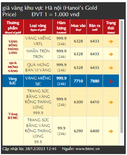 | Giá vàng niêm yết tại Công ty TNHH MTV Vàng Bạc Đá quý Sài Gòn. Ảnh chụp website màn hình lúc 13h ngày 28/12/2023 |