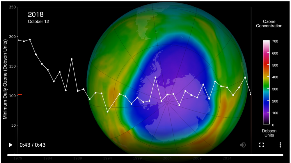 Hình ảnh vệ tinh và dữ liệu về lỗ thủng tầng ozone ở Nam Cực từ năm 1979 đến năm 2018 được công bố tại Trung tâm Truyền thông Goddard của NASA; điều này cung cấp một sự hiểu biết trực quan về sự phát triển của lỗ thủng tầng ozone ở Nam Cực trong giai đoạn này.