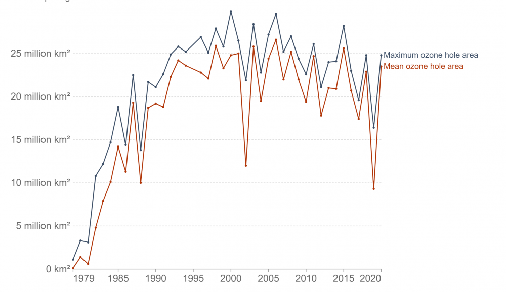 Kể từ năm 1979, có thấy sự gia tăng rõ rệt của khu vực lỗ thủng tầng ozone ở Nam Cực, đạt mức tối đa 30 triệu km 2 vào đầu những năm 2000. Tuy nhiên, kể từ cuối những năm 1990, khu vực lỗ thủng tầng ozone đã ổn định khoảng 20 đến 25 triệu km 2. Vào năm 2018, Chương trình Aura của NASA đã công bố kết quả đầu tiên cho thấy những dấu hiệu ban đầu rõ ràng về sự phục hồi lỗ thủng tầng ozone