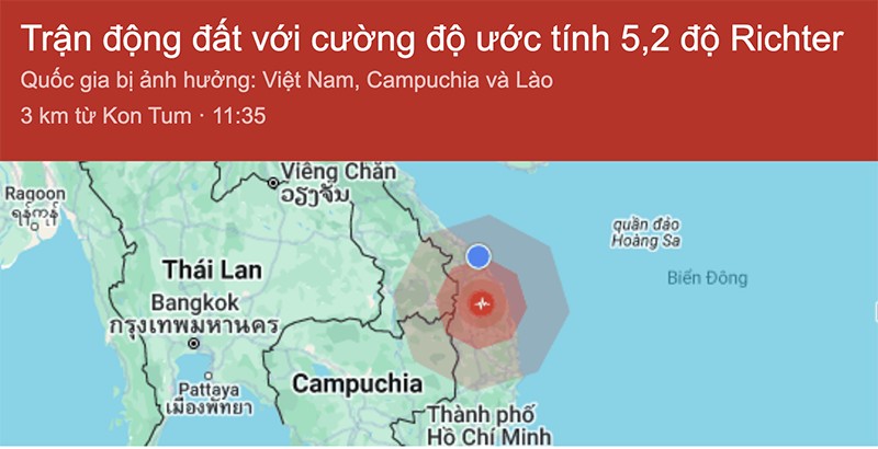 | Vị trí trận động đất xảy ra vào khoảng 11h35 ngày 28/7 tại tỉnh KonTum khiến nhiều nhà cửa ở Đà Nẵng bị rung lắc |