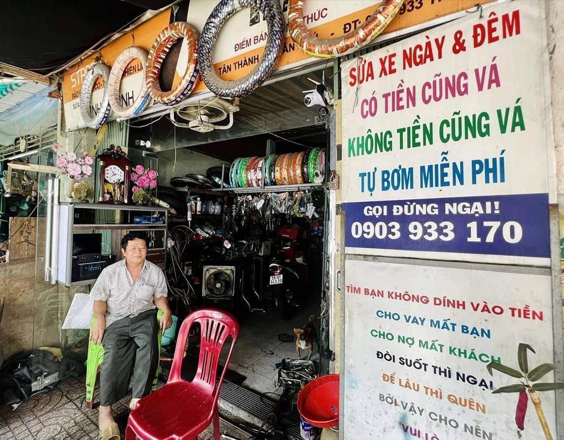 Giữa dòng xe cộ tấp nập trên phố Âu Cơ, quận Tân Phú, TP. Hồ Chí Minh, có một tiệm sửa xe nhỏ, giản dị nhưng đầy ắp tình người. Tấm biển với dòng chữ “Không tiền cũng vá” là lời nhắn gửi nghĩa tình của ông Võ Thành Vinh, 63 tuổi.