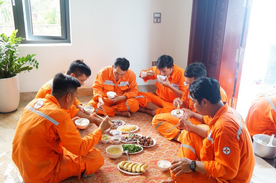 | Bữa cơm sau những giờ lao động vất vả của công nhân ngành điện. (Ảnh: Hùng Mạnh) |