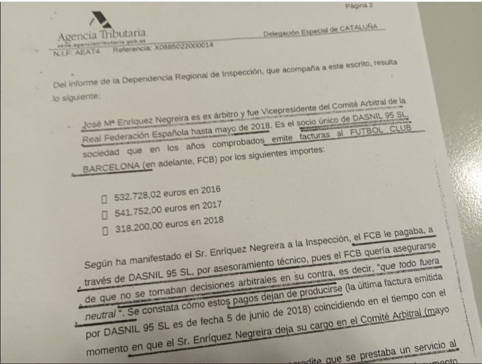 Cụ thể, theo công bố của Liên đoàn bóng đá Tây Ban Nha, Barcelona đã thanh toán số tiền 1,4 triệu Euro cho công ty DASNIL 95 thuộc sở hữu của Jose Maria Enriquez Negreira từ năm 2016 đến 2018. Phân tích dữ liệu cho thấy các khoản thanh toán này được thực hiện trong nhiệm kỳ của Josep Maria Bartomeu, người khi ấy vẫn đang là chủ tịch của Barca.