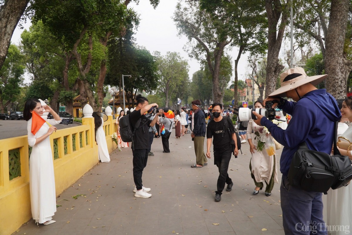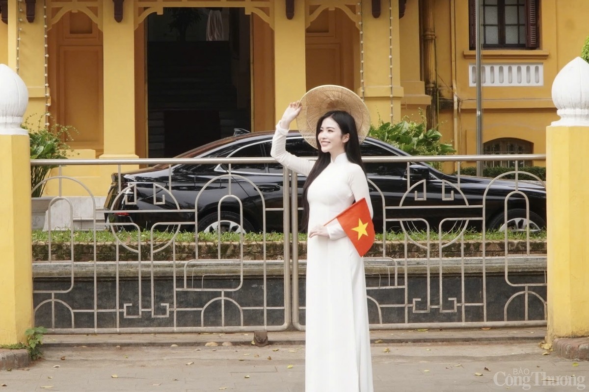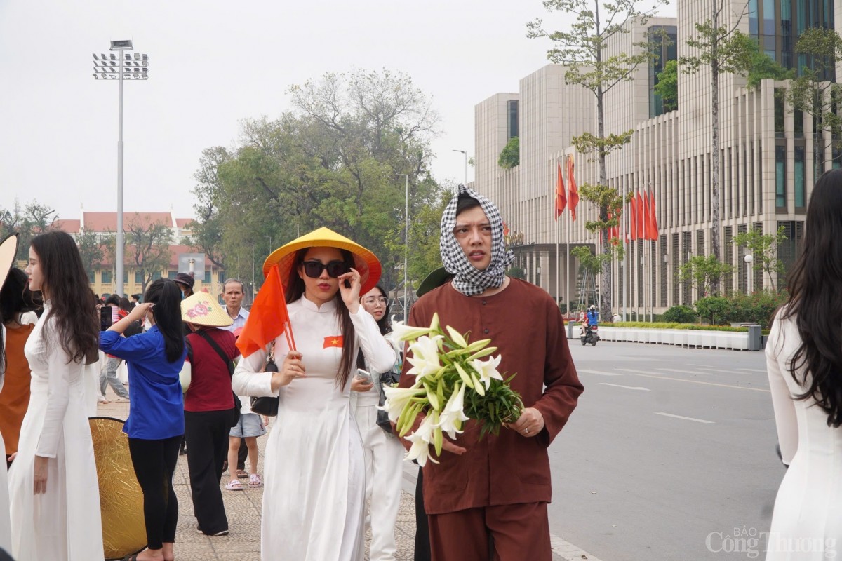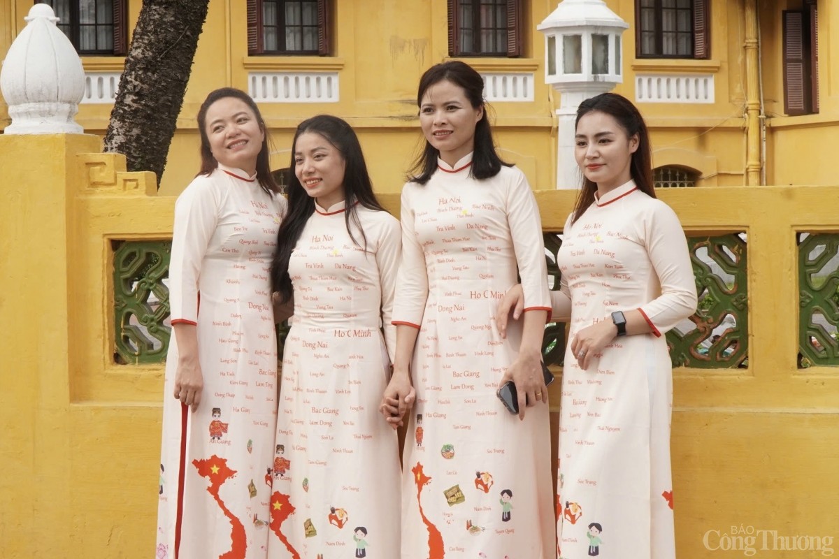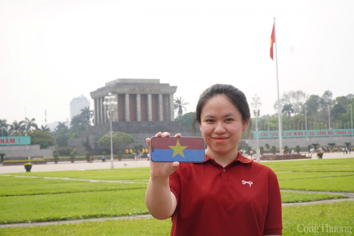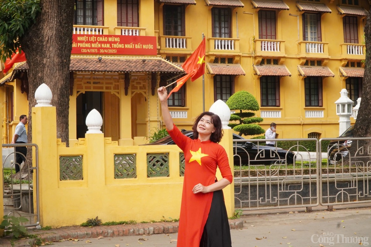 | Nhiều bạn trẻ chọn diện áo dài đỏ, trắng hoặc họa tiết dân tộc, tay cầm lá cờ nhỏ hoặc đứng dưới lá cờ lớn tung bay trên nền trời xanh. |