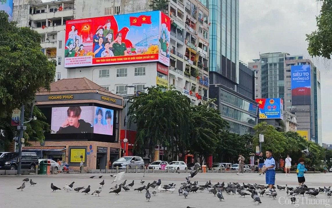 | Chào mừng kỷ niệm 79 năm Cách mạng Tháng Tám và Quốc khánh 2/9, trên khắp các tuyến đường chính tại TP. Hồ Chí Minh được trang trí cờ hoa, băng rôn, khẩu hiệu, hệ thống màn hình led, pano - áp phích rực rỡ và các hình ảnh lịch sử.(Ảnh: Thanh Minh) |