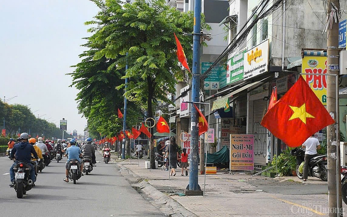 Chào mừng kỷ niệm 79 năm Cách mạng Tháng Tám và Quốc khánh 2/9, trên khắp các tuyến đường chính tại TP. Hồ Chí Minh như: Nam Kỳ Khởi Nghĩa, Nguyễn Văn Trỗi, Lê Duẩn, Nguyễn Thị Minh Khai, Đồng Khởi, Nguyễn Huệ, Lê Lợi, Cách Mạng Tháng Tám, Đinh Tiên Hoàng, Xô Viết Nghệ Tĩnh, Điện Biên Phủ, Bạch Đằng, Quang Trung, Trường Chinh, Cộng Hòa, Tô ký, Nguyễn Ảnh Thủ, Quốc lộ 22... được trang trí cờ hoa, băng rôn, khẩu hiệu, hệ thống màn hình led, pano - áp phích rực rỡ và các hình ảnh lịch sử.