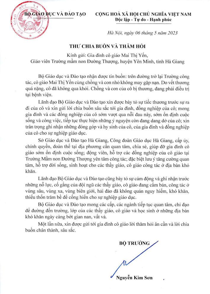 Mới đây, Bộ trưởng Giáo dục và Đào tạo Nguyễn Kim Sơn vừa có thư chia buồn và thăm hỏi tới gia đình cô giáo Mai Thị Yến (giáo viên Trường Mầm non Đường Thượng, huyện Yên Minh, tỉnh Hà Giang) vừa qua đời do tai nạn trên đường trở lại trường công tác.