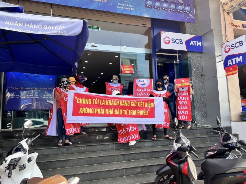 | Nhiều người tụ họp ở các ngân hàng SCB để căng băng rôn, biểu tình đòi ngân hàng hoàn trả tiền bị lừa mua trái phiếu |