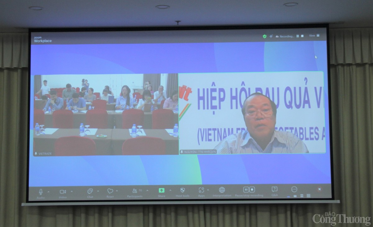 | Ông Đặng Phúc Nguyên - Tổng thư ký Hiệp hội rau quả Việt Nam chia sẻ trực tuyến tại hội thảo. Ảnh Phương Cúc |