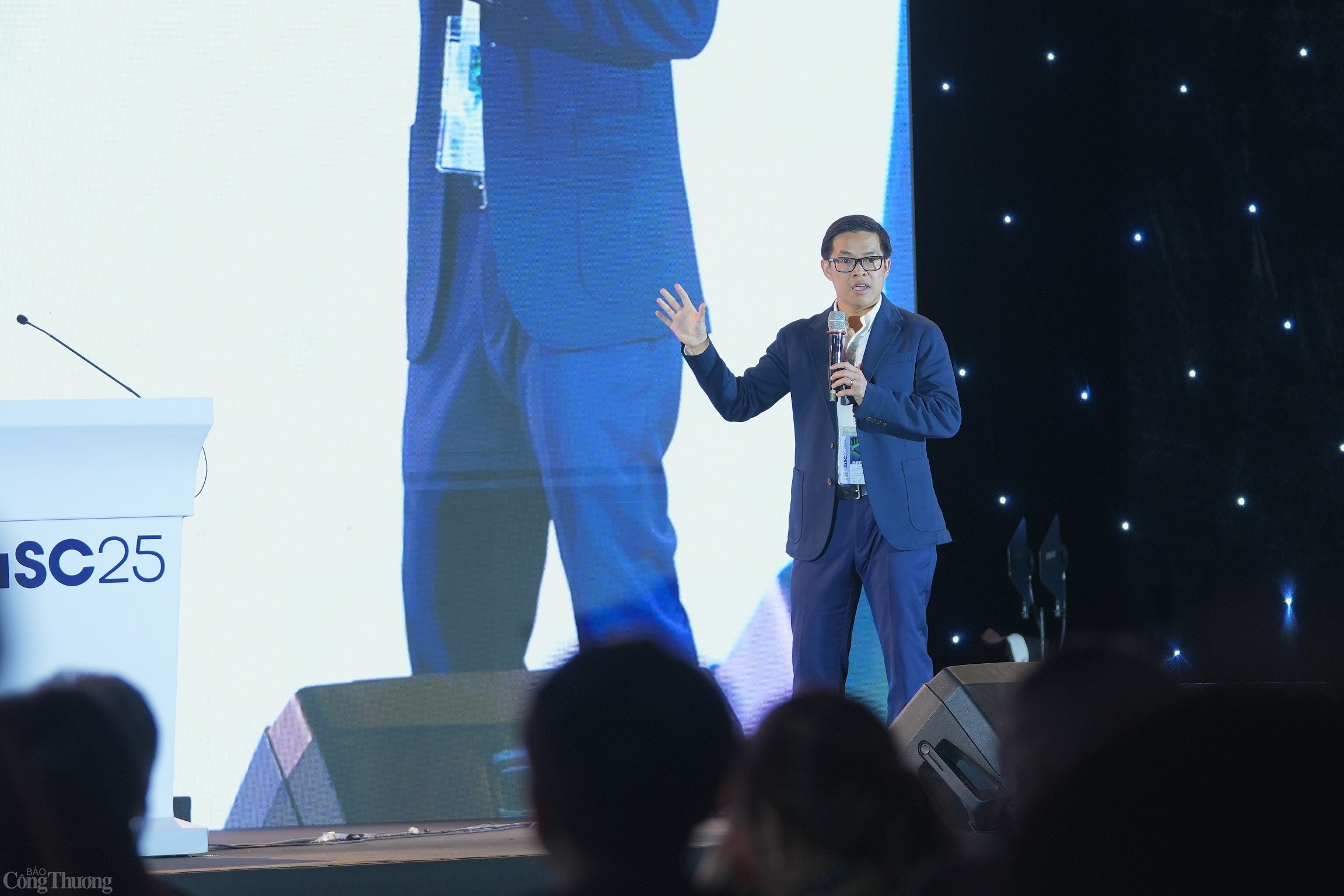 | GS. Hồ Phạm Minh Nhật, Đại học Texas tại Austin (Mỹ) phát biểu ở AISC 2025. Ảnh: Thanh Tuấn |