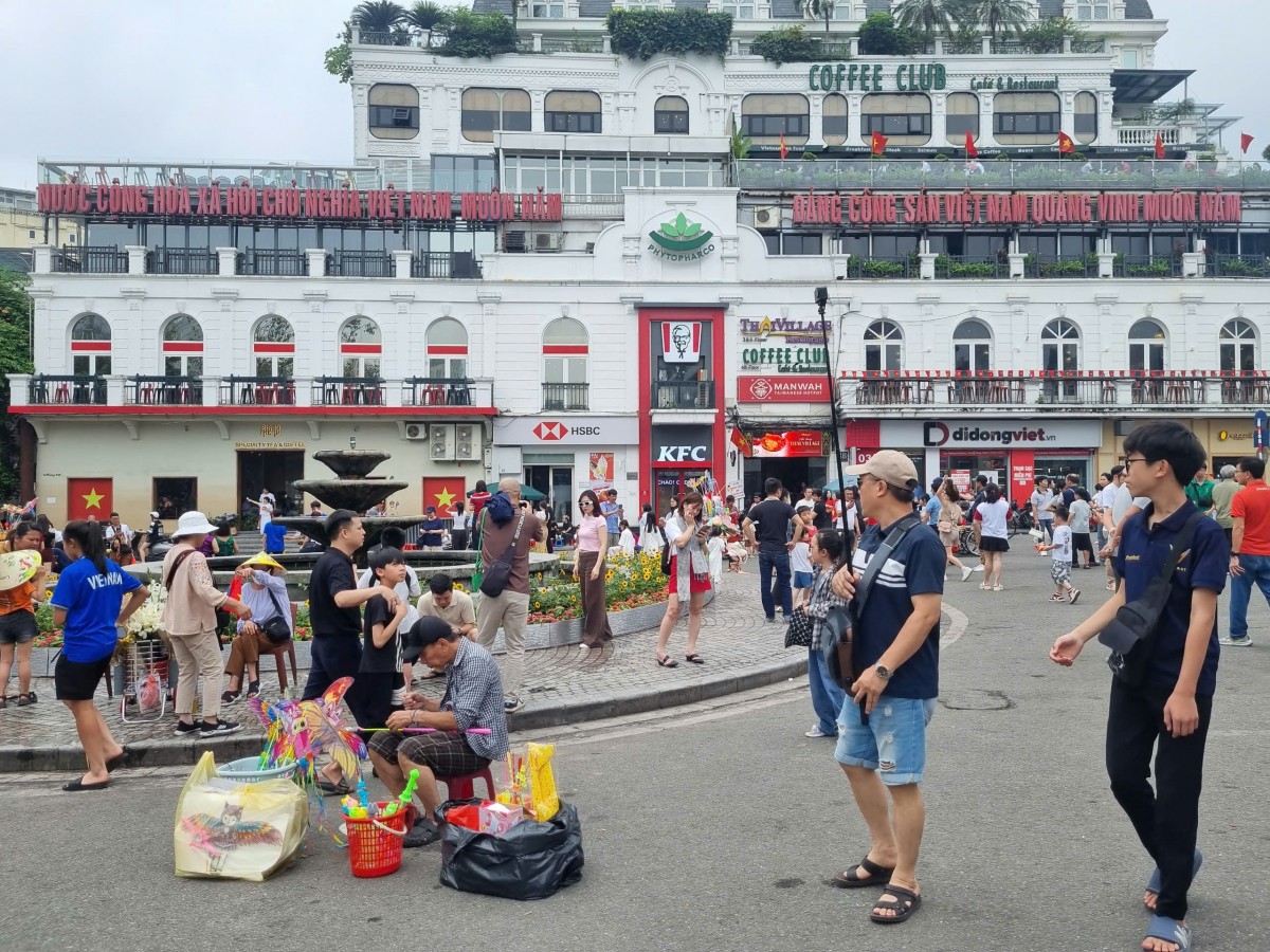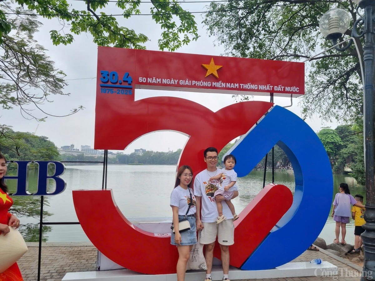 | Tại khu vực bờ Hồ Hoàn Kiếm sáng 30/4, đông đảo người dân và du khách đổ về dạo chơi, thăm quan. |