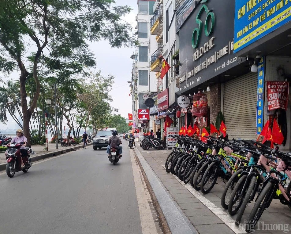 | Trên một tuyến phố ven Hồ Tây, các cửa hàng kinh doanh dịch vụ như cho thuê xe đạp, cà phê, ăn uống đồng loạt treo cờ đỏ sao vàng, trang trí rực rỡ nhằm chào mừng ngày lễ 30/4. |