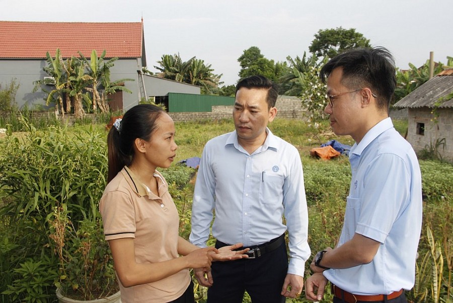 | Chị Lê Thị Hóa (trái) chia sẻ mong muốn tham gia bảo hiểm xã hội trở lại với cán bộ bảo hiểm xã hội |