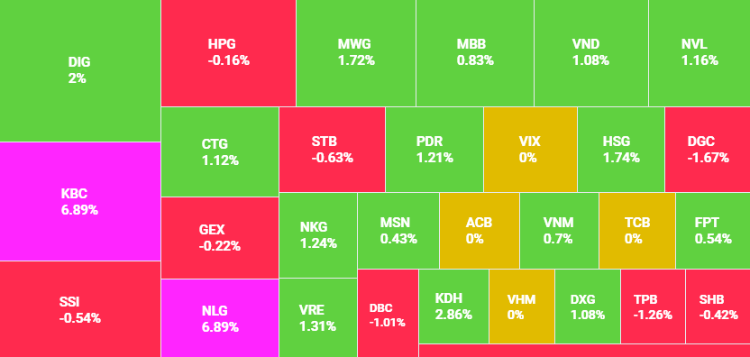 Lực đẩy chính trong phiên đến từ cổ phiếu bất động sản kéo chỉ số VN-Index tăng 3,13 điểm, tương đương 0,25%, lên 1.261,41 điểm. Bên cạnh đó, các cổ phiếu bất động sản khác đa phần cũng giao dịch tích cực. Theo đó, BCM tăng 2,83%, VRE tăng 1,31%, NVL tăng 1,16%, KDH tăng 2,86%, PDR tăng 1,21%, DIG tăng 2%, CTD tăng 4,35%...