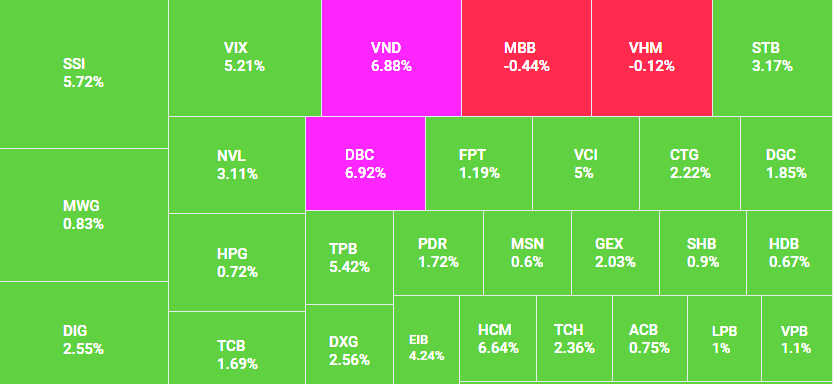 Cổ phiếu chứng khoán “thăng hoa” đẩy VN-Index tăng hơn 15 điểm