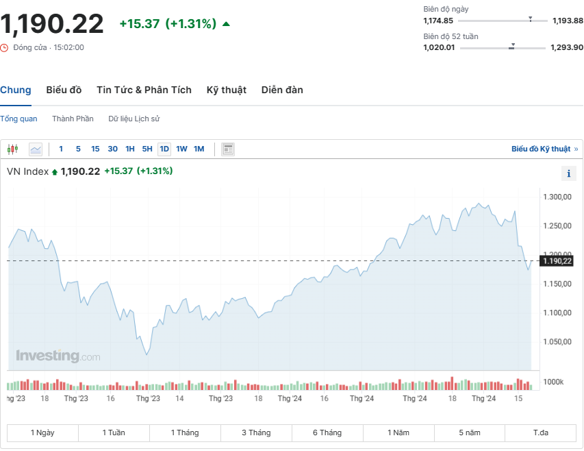 Đóng cửa phiên giao dịch ngày 22/4, chỉ số VN-Index tăng 15,37 điểm, tương đương 1,31%, lên 1.190,22 điểm, gây ấn tượng nhất trong phiên là cổ phiếu chứng khoán.