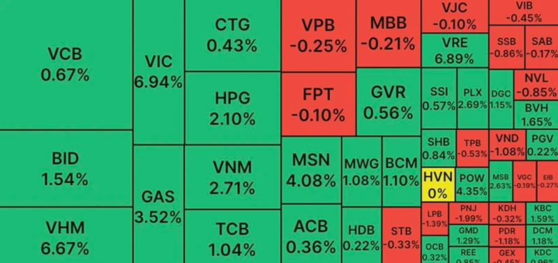 Nhóm VN30 có 14 mã tăng giá, trong đó nhóm Vingroup (gồm VIC, VHM và VRE đều tăng kịch trần) duy trì được sức mạnh trong suốt cả phiên khiến tâm lý lạc quan lan tỏa ra toàn thị trường. Cổ phiếu Vingroup bật tăng mạnh mẽ sau thông tin hãng xe điện VinFast (VFS) có tín hiệu tốt về việc triển khai bán hàng trên phạm vi toàn cầu.