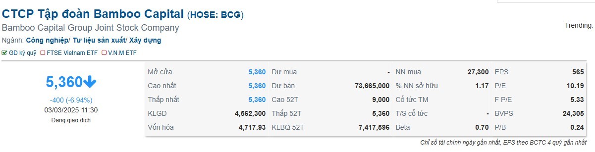 | Cổ phiếu BCG của Bamboo Capital bị xả cực mạnh trong phiên sáng nay (3/3/2025). |