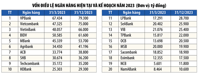 Vài tháng gần đây, liên tiếp các ngân hàng được Ngân hàng Nhà nước (NHNN) chấp nhận tăng vốn điều lệ. Ngay đầu tháng 6/2023, LPBank đã được NHNN chấp thuận tăng vốn điều lệ từ 17.291 tỷ đồng lên mức 28.676 tỷ đồng thông qua nhiều cấu phần; SeABank cũng được chấp thuận tăng vốn điều lệ tối đa thêm 5.500 tỷ đồng, đưa vốn điều lệ lên 25.903 tỷ đồng.