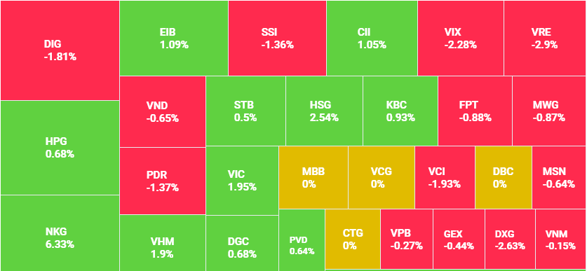 Cụ thể, cổ phiếu bất động sản hạ nhiệt sau khi toả sáng ngày hôm qua. Nhiều mã giảm đáng kể như VRE giảm 2,9%, NVL giảm 1,2%, KDH giảm 1,61%, PDR giảm 1,37%, DIG giảm 1,81%, NLG giảm 1,87%, VPI giảm 1,03%, DXG giảm 2,63%, CTD giảm 1,82%, LGC giảm kịch sàn. Tuy vậy, sắc xanh cũng không hẳn lép vế, đặc biệt là bộ đôi vốn hoá lớn nhất sàn là VHM - VIC đều tăng gần 2%.