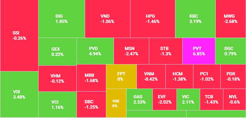 Ở nhóm sản xuất cũng đan xen sắc xanh - đỏ. Điển hình là HPG giảm 1,46%, VNM giảm 0,42%, MSN giảm 2,47%, SAB giảm 1,51% nhưng GVR tăng 1,55%, DGC tăng 0,79%, VGC tăng 0,34%, HT1 tăng 2,64%.