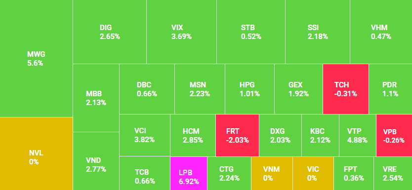 Nhóm cổ phiếu ngân hàng vốn hoá lớn tăng tốt, dẫn dắt đà phục hồi của chỉ số chung. Theo đó, BID tăng 3,74%, CTG tăng 2,24% và MBB tăng 2,13% cùng với LPB tăng kịch trần đều lọt vào Top 5 cổ phiếu tác động tích cực nhất đến VN-Index. Các cổ phiếu khác đa phần ghi nhận sắc xanh, ngoại trừ VCB và VPB giảm nhẹ.