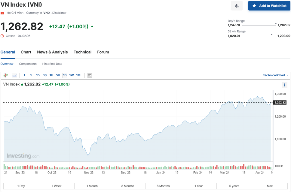 Nhiều cổ phiếu ngân hàng vốn hoá lớn tăng tốt, dẫn dắt đà phục hồi của chỉ số chung kéo VN-Index tăng 12,47 điểm, tương đương 1%, lên 1.262,82 điểm.