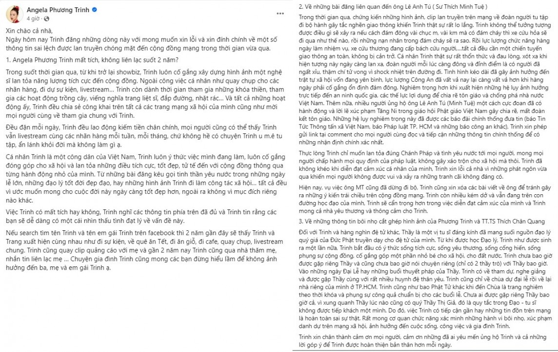 | Angela Phương Trinh xin lỗi, gỡ bỏ bài đăng về ông Thích Minh Tuệ. Đồng thời, đính chính những thông tin thất thiệt trong thời gian qua về ông Thích Chân Quang. |
