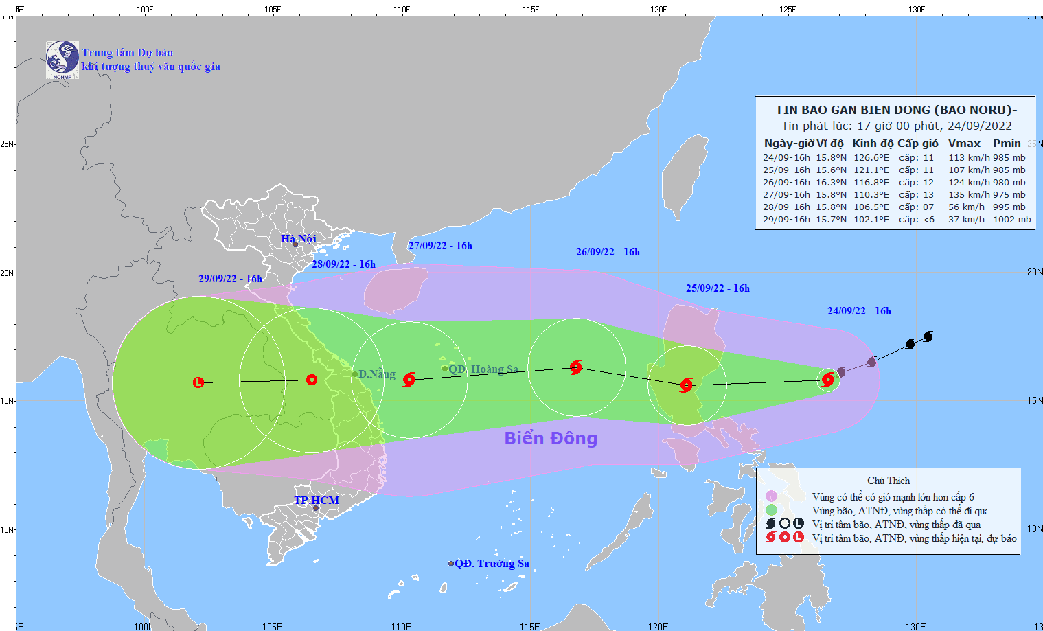 Trong 48 đến 72 giờ tiếp theo, bão di chuyển nhanh theo hướng Tây, mỗi giờ đi được khoảng 30km, có xu hướng mạnh thêm. Đến 16 giờ ngày 27/9, vị trí tâm bão ở khoảng 15,8 độ Vĩ Bắc; 110,3 độ Kinh Đông, cách Thừa Thiên Huế - Quảng Ngãi khoảng 190km về phía Đông. Sức gió mạnh nhất vùng gần tâm bão mạnh cấp 12-13 (118-149km/giờ), giật cấp 16.