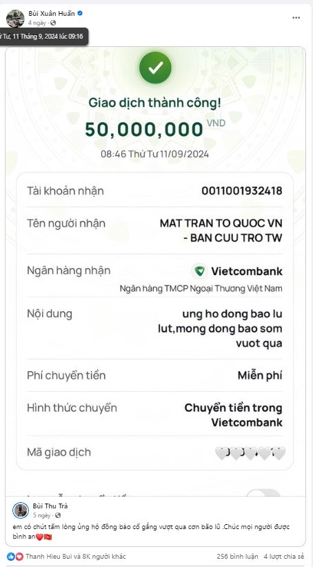 Mới đây nhất, tài khoảnFacebook Bùi Thu Trà (con gái của Huấn Hoa Hồng) chia sẻ việc mình đã chuyển khoản ủng hộ đồng bào với số tiền 50 triệu đồng tới tài khoản 0011001932418 của Ủy ban Trung ương Mặt trận Tổ quốc Việt Nam. “Em có chút tấm lòng ủng hộ đồng bào cố gắng vượt qua cơn bão lũ. Chúc mọi người được bình an”, tài khoản Bùi Thu Trà viết.