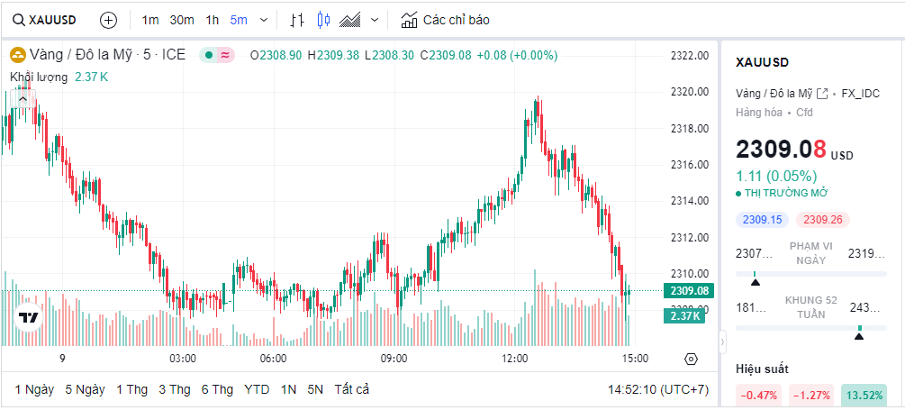Tình hình giá vàng thế giới hôm nay 9/5/2024 có sự tăng nhẹ so với phiên mở cửa hôm trước. Cụ thể, vào thời điểm 14h52, giá vàng thế giới đang ở mức 2309,08 USD/ounce, tăng 0,05% (tức 1,11 USD) so với ngày hôm trước.