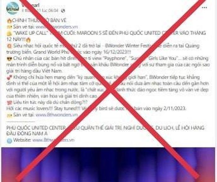 Công an thành phố Hà Nội cho biết, hiện nay trên không gian mạng xuất hiện các trang web, fanpage mạo danh Công ty Cổ phần Vinpearl trực thuộc Tập đoàn Vingroup đăng tải các bài viết quảng cáo bán vé tham dự chương trình Siêu nhạc hội quốc tế mùa thứ 2 - 8Wonder Winter Festival sẽ diễn ra tại Quảng trường biển, Grand World Phú Quốc, vào ngày 16/12 tới.