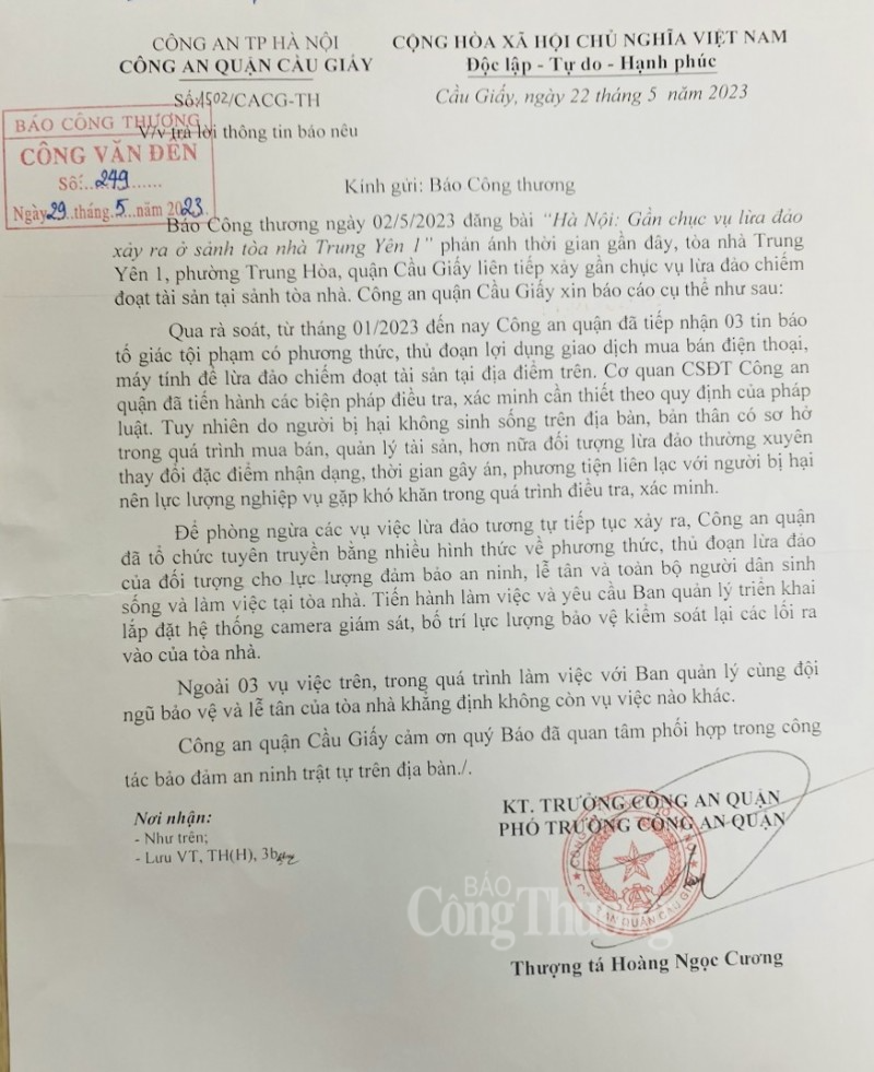 Sáng 29/5, Báo Công Thương nhận được công văn trả lời thông tin báo nêu của Công an quận Cầu Giấy (Công an TP.Hà Nội).