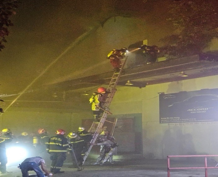 Phòng Cảnh sát phòng cháy, chữa cháy và cứu nạn cứu hộ điều động 1 xe tải chở phương tiện và 2 xe chỉ huy đến hiện trường vụ cháy để chỉ đạo việc cứu hỏa.
