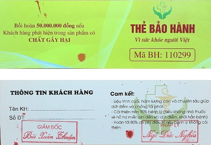 | Thông tin ghi trên Thẻ bảo hành của các đối tượng lừa đảo. (Ảnh: Công an cung cấp) |