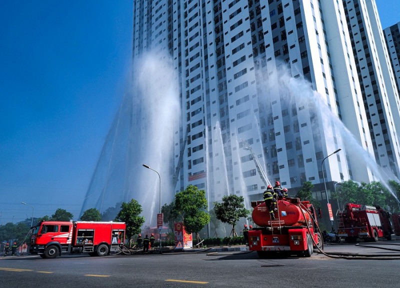 Bước 4 - Chữa cháy bằng các phương tiện có sẵn: Sử dụng các bình chữa cháy xách tay, lăng vòi chữa cháy được lắp đặt tại các kệ/hộp chữa cháy tại khu vực hành lang căn hộ để khống chế và dập tắt đám cháy.
