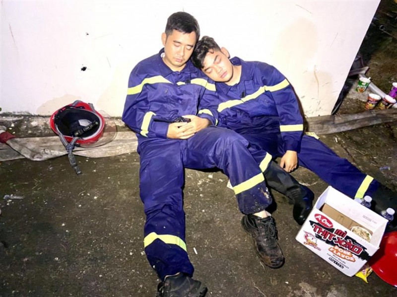 Các cán bộ, chiến sĩ nghỉ ngời sau khi đám cháy đã được không chế.